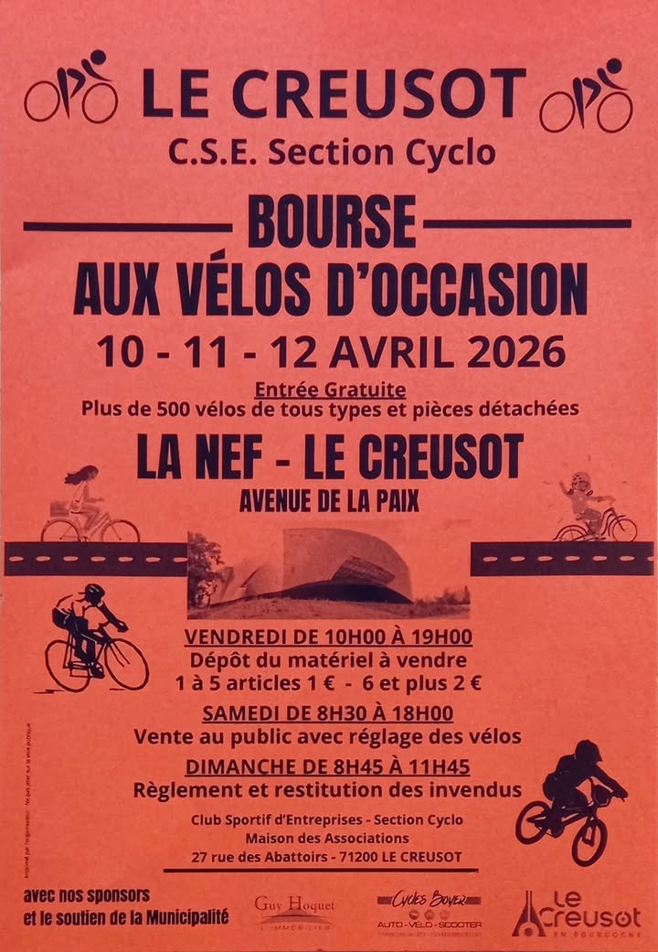 Actualités de Creusot Cyclisme » Bourse aux vélos d’occasion CSE Section Cyclo 10/11/12 Avril 2026 LA NEF Le Creusot