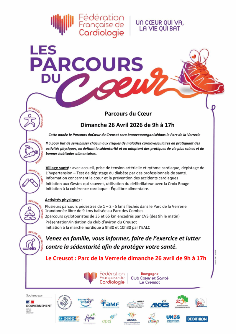 Bonjour,Le Club Coeur et Santé du Creusot a le plaisir de vous informer de l’organisation du Parcours du Coeur 2026qui se tiendra le dimanche 26 avril 2026 de 9h à 19h sur l’Esplanade Duchêne au Parc de la Verrerie du Creusot.A cette occasion, nous vous serions reconnaissants de bien vouloir relayer cette information auprès de vos adhérents et de votre réseau.